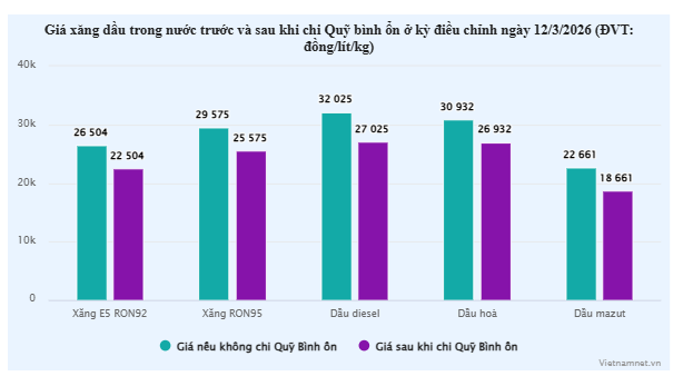 Theo Bộ Công Thương, nếu không sử dụng Quỹ Bình ổn giá xăng dầu, giá cơ sở các mặt hàng này tại thị trường ngày 12/3 sẽ neo ở ngưỡng rất cao. Cụ thể, xăng E5 RON92 ở mức 26.504 đồng/lít, xăng RON95-III có giá 29.575 đồng/lít; dầu diesel 0.05S là 32.025 đồng/lít; dầu hỏa ở mức 30.932 đồng/lít và dầu mazut 180CST 3.5S ở mức 22.661 đồng/kg.
