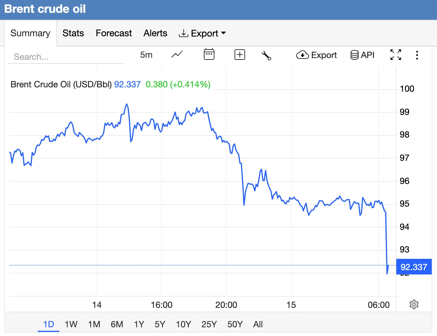 Trading Economics nhận định giá dầu Brent kỳ hạn tiếp tục giảm hơn 4% xuống còn 95 USD/thùng vào thứ Ba, giữa lúc có thông tin cho rằng các cuộc đàm phán giữa Mỹ và Iran có thể sớm nối lại, làm dấy lên lạc quan về khả năng mở cửa hoàn toàn eo biển Hormuz.