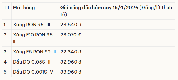 Giá xăng dầu hôm nay 15/4/2026 lúc 4h15 sáng. Bảng giá xăng dầu Petrolimex, PVOIL, Mipecorp, Thalexim hôm nay 15/4/2026