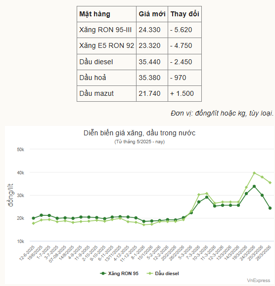 Ngày 27/3/2026, báo Thanh Niên đăng tải bài viết: "Giá xăng dầu hôm nay 27.3.2026: Giảm các loại thuế, xăng về 24.000 đồng/lít" có nội dung như sau: