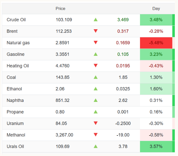Tổng thể, bảng giá hôm nay cho thấy xu hướng tăng xuất hiện ở dầu thô, xăng, than, ethanol, naphtha, propane và Urals Oil, còn Brent, khí tự nhiên, dầu sưởi, uranium và methanol giảm giá. Trong số các mặt hàng được cập nhật, khí tự nhiên giảm mạnh nhất với 5,48%, còn Urals Oil và dầu thô là hai mặt hàng tăng nổi bật nhất.