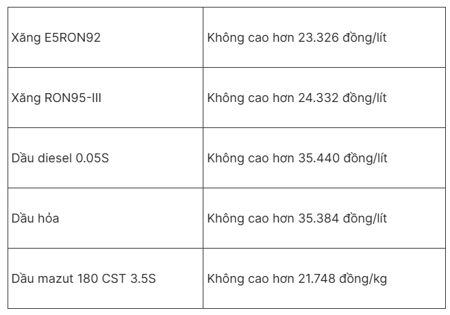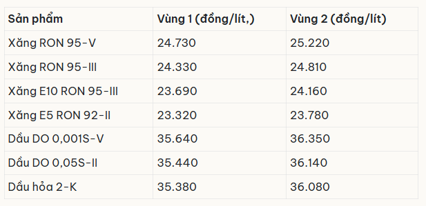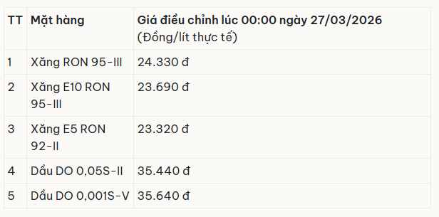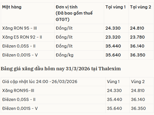Tổng công ty Xăng dầu Quân đội (Mipecorp) điều chỉnh giá các mặt hàng xăng dầu từ 24h00' ngày 26/3/2026, mức giá mới cụ thể như sau: