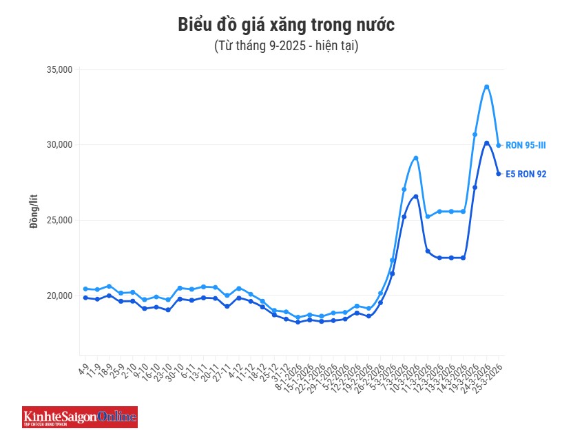 Từ 14 giờ ngày 25-3, Liên bộ Công Thương - Tài chính đã điều chỉnh giá bán lẻ với các mặt hàng xăng. Cụ thể, giá xăng E5 RON92 giảm 2.039 đồng xuống 28.075 đồng/lít, còn xăng RON95-III giảm 3.883 đồng xuống 29.957 đồng/lít.