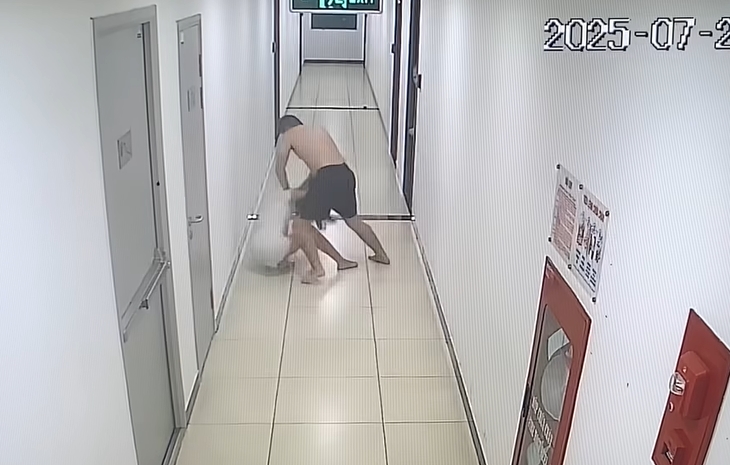 Theo hình ảnh trích xuất từ camera giám sát, vào khoảng 21h54 ngày 28/7, có thể thấy một người đàn ông c:ởi tr:ần đã túm tóc, kéo vợ ra khỏi căn hộ, quật ngã xuống nền rồi liên tục đấm, đá vào mặt, lưng và tay chân nạn nhân.