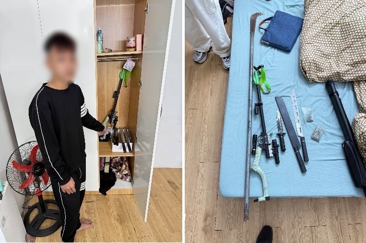 Đối tượng được xác định là N.P.H.M. (SN 2009, trú tại Tây Hồ, Hà Nội). Khám xét phòng trọ của M., lực lượng chức năng thu giữ nhiều v:ũ kh:í nguy hiểm gồm: 1 tuýp sắt hàn dao nhọn, 1 ná cao su, 3 con dao, 2 túi bi sắt và 1 đèn pin ch:ích điện.