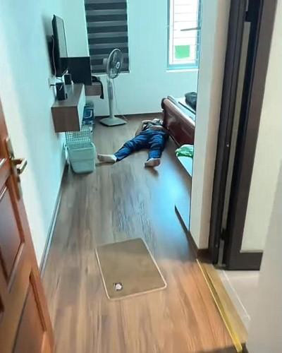 Mới đây, mạng xã hội xôn xao hình ảnh một người đàn ông nằm ngủ ngon dưới nền nhà trong một căn phòng ngủ. Sau đó, người này được một người đàn ông khác khệ nệ bế ra khỏi nhà.