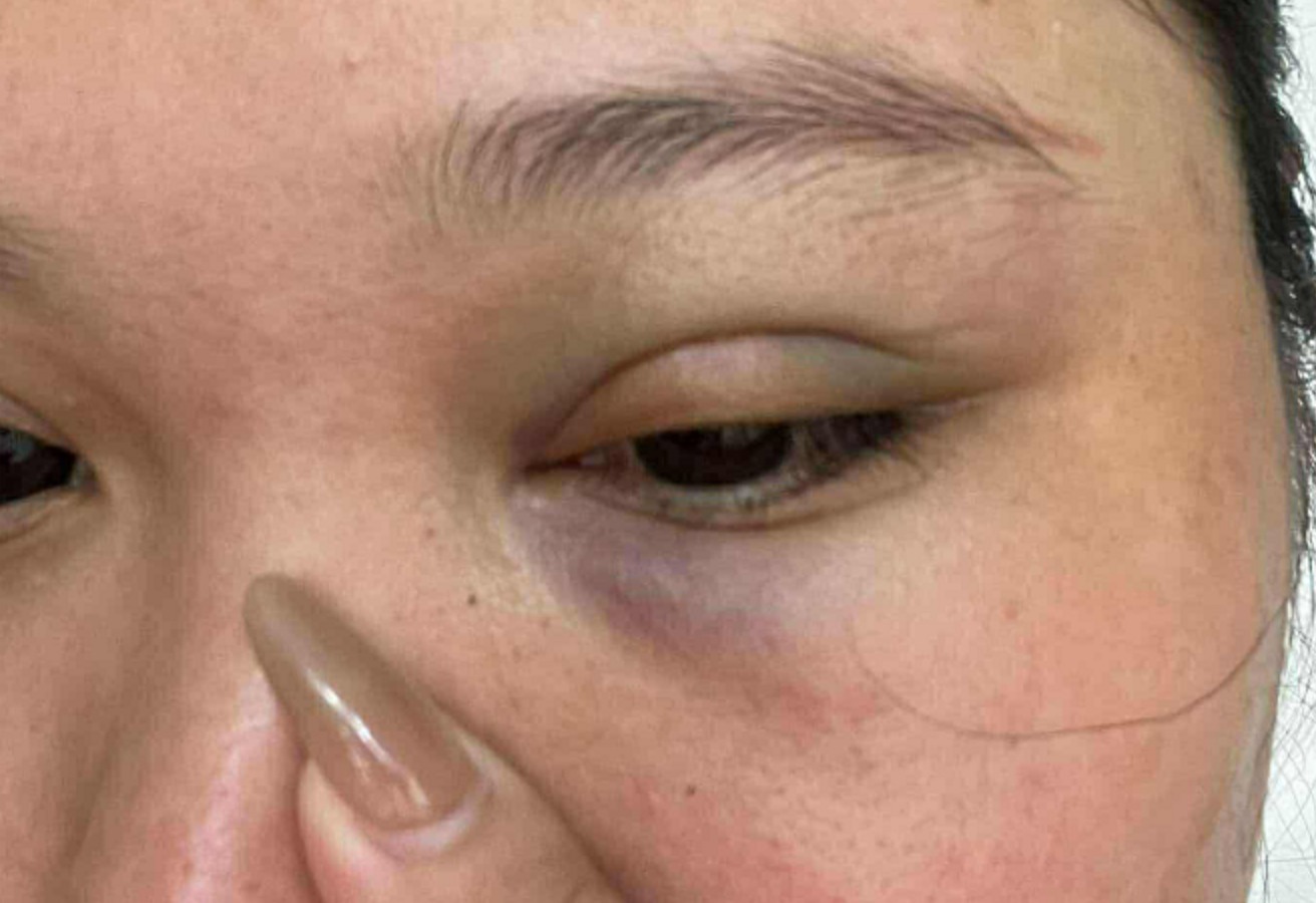 Cú đánh khiến chị N. gãy xương hốc mắt trái, tụ máu trong và rạn xương hàm. “Tôi ngã xuống, mắt đau nhức, mặt sưng tím. Bạn tôi cũng bị họ đánh liên tục vào đầu bằng tay và ghế, giờ vẫn còn đau đầu, buồn nôn”, chị N. nghẹn giọng kể.