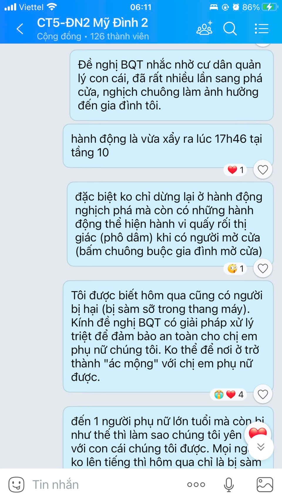 Lo ngại ảnh hưởng đến an toàn của cư dân, đặc biệt là phụ nữ và trẻ em, chị đã đăng thông tin cảnh báo trong nhóm cư dân và đề nghị ban quản lý tòa nhà lưu ý. Sau khi bài đăng xuất hiện, chị H. cho hay bị một số người, được cho là người thân của nam thanh niên trên, chặn lại và hanh:hung tại khu vực hành lang.