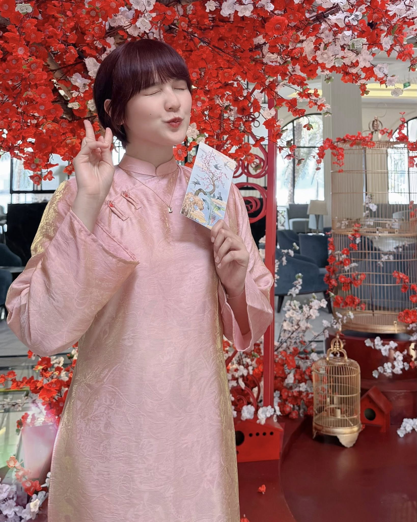 Năm 2025, cô nàng cũng diện trang phục màu hồng đón Tết.