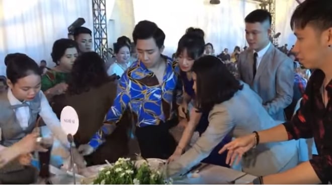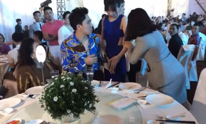 Trấn Thành ngồi bên cạnh liền giúp vợ cầm lấy ví. Anh đứng dậy, lo lắng cho Hari Won nhưng không to tiếng với người nhân viên. Sự việc khiến nhiều người chú ý trong bữa tiệc.