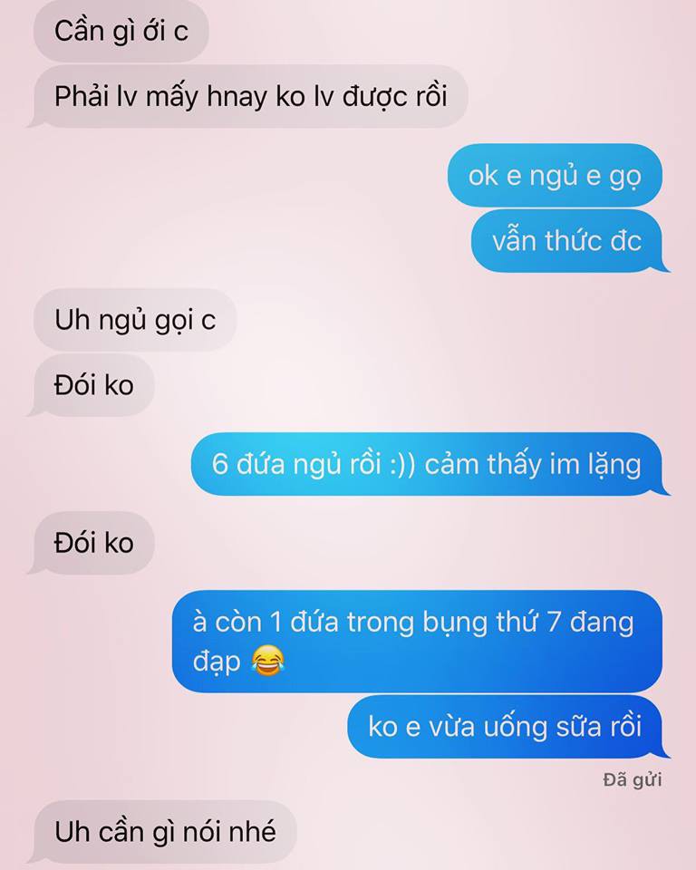 Hằng chia sẻ đoạn tin nhắn với chồng và viết rằng: "Nhà không có gì ngoài trẻ con. Cảm thấy được tôi luyện thần kinh thép, đầu còn không dám đau nữa luôn".