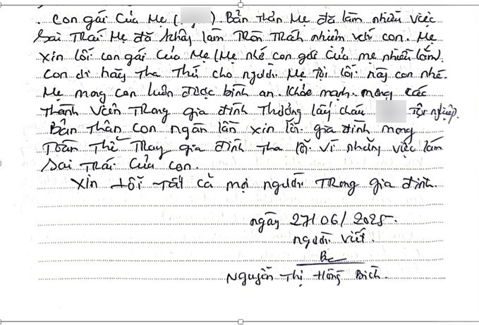 Trong thư, Bích xin lỗi mẹ, con gái, gia đình chồng và các anh chị em trong gia đình mình.