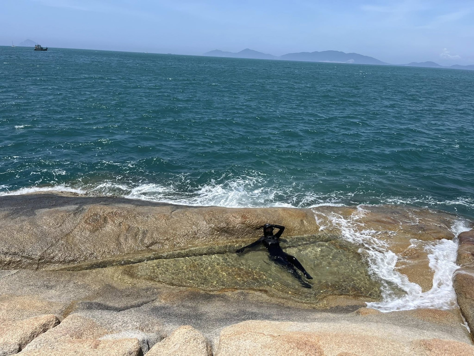 Nhưng điều gây chú ý nhất trong bài đăng khi ấy của Công Vinh, không phải là khoảnh khắc tình cảm của anh và vợ mà là một nhân vật... không lộ diện. Chính xác hơn, trong hình ảnh chụp trước biển, xuất hiện một hình bóng đen nằm ở mép nước, toàn thân được che đậy bởi bộ đồ bơi màu đen kín mít. Nếu Công Vinh không nói, khó ai có thể tin nhân vật "bóng đen" bí ẩn như bước ra từ phim Conan này chính là vợ anh. Không lộ diện chỉ một milimet da thịt, dù là khuôn mặt, hình dáng hay bất kỳ đặc điểm nào, Thủy Tiên trông như một ninja đang ngụy trang trên bãi biển.