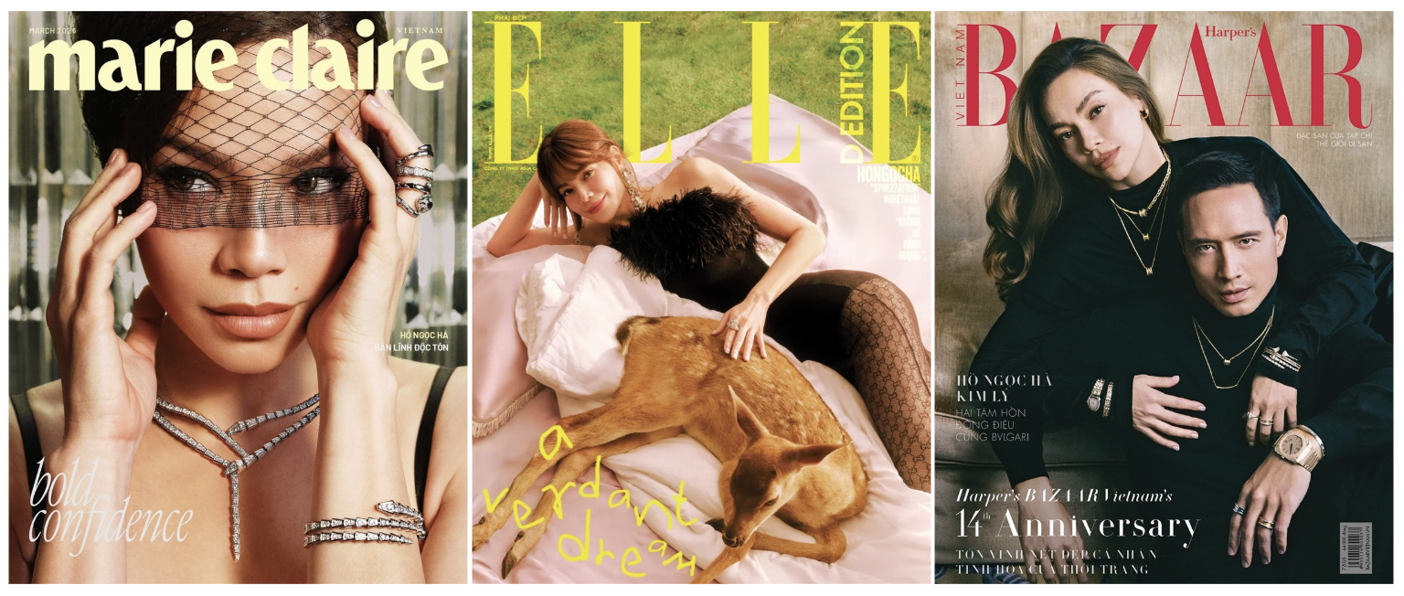 Bên cạnh Gucci, cô cũng được nhiều thương hiệu lớn mời hợp tác. Hình ảnh Hà Hồ thường xuyên được đăng tải trên các tạp chí như Elle và Harper's Bazaar. Trong nước, Marie Claire Vietnam chọn Hà Hồ làm gương mặt trang bìa tháng 3/2026.