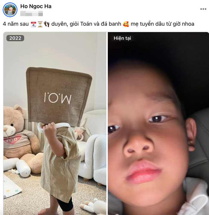 Theo đó, Hồ Ngọc Hà đăng tải hai khung hình đặt cạnh nhau. Ở bức ảnh năm 2022, Leon khi ấy còn nhỏ xíu, đáng yêu với dáng đứng chập chững, đội chiếc túi vải che gần hết khuôn mặt trong không gian phòng khách ngập tràn đồ chơi. Hình ảnh mang đến cảm giác ngây thơ, đúng chuẩn "em bé quốc dân" ngày nào.