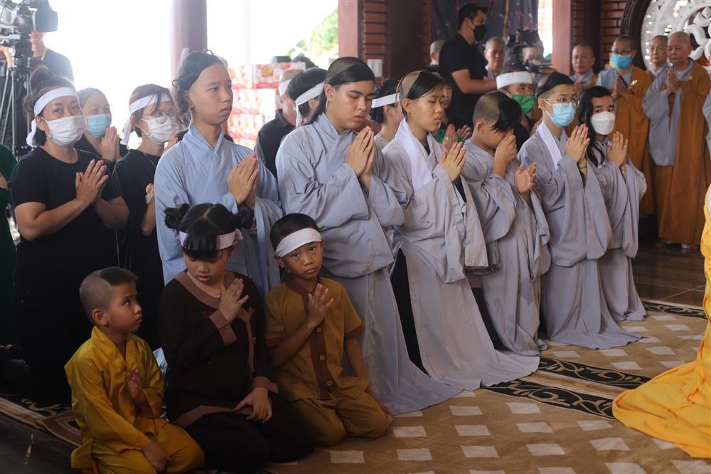 Đức Hiếu, Thiêng Ngân, Tuyết Nhung, Quỳnh Trang... cùng đàn con nuôi cố ca sĩ đội khăn tang, chấp tay khấn vái, ánh mắt buồn bã.
