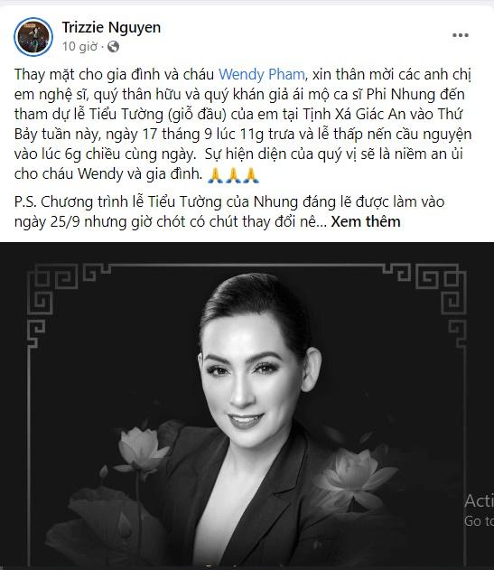 Sự hiện diện của quý vị sẽ là niềm an ủi cho cháu Wendy và gia đình. Chương trình lễ Tiểu Tường của Nhung đáng lẽ được làm vào ngày 25/9 nhưng giờ chót có chút thay đổi nên phải đổi sớm lên một tuần. Gia đình thành thật xin lỗi về điều này", Trizzie Phương Trinh thông báo.