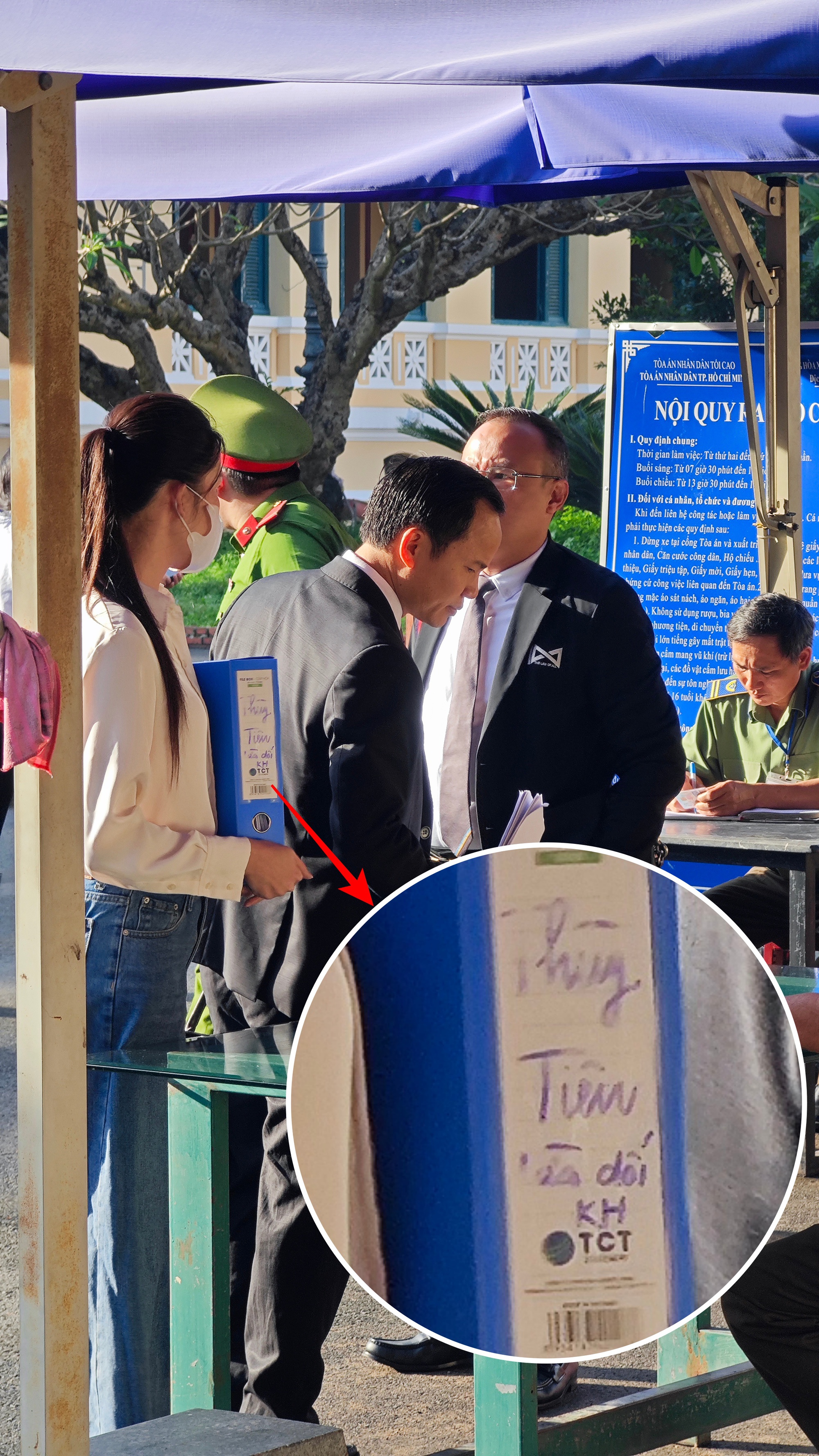 Thuý Vi đi thẳng vào bên trong phiên toà xét xử, trên tay ôm 1 chiếc hộp