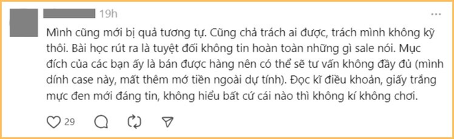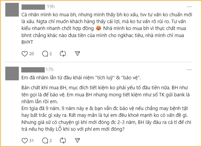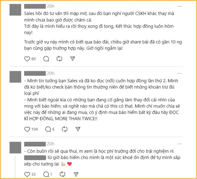 Bài đăng hiện vẫn đang thu hút sự quan tâm của CĐM. Trong phần bình luận, có người an ủi, có người chia sẻ bài học đắt giá tương tự, cũng có người cho rằng đơn vị bảo hiểm không có lỗi, lỗi nằm ở tư vấn viên và ở chính người mua bảo hiểm.