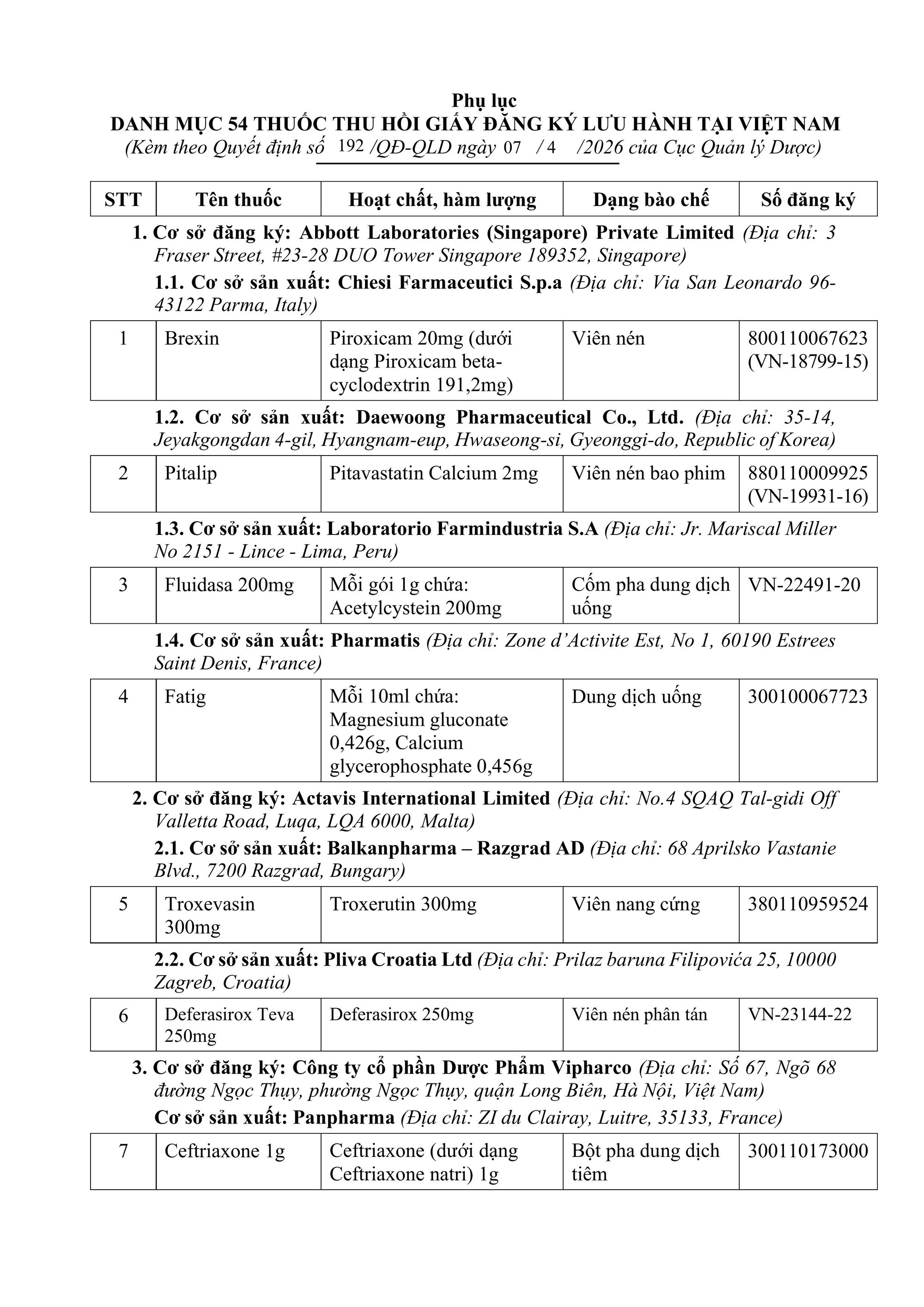 Ngày 8/4, Cục Quản lý Dược - Bộ Y tế ban hành Quyết định 192 thu hồi giấy đăng ký lưu hành của 54 loại thuốc theo đề nghị tự nguyện từ các cơ sở đăng ký.