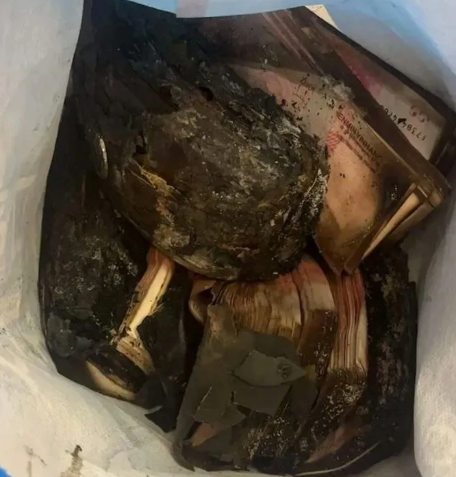 Các tờ tiền bị dính chặt sau vụ cháy - Ảnh: News