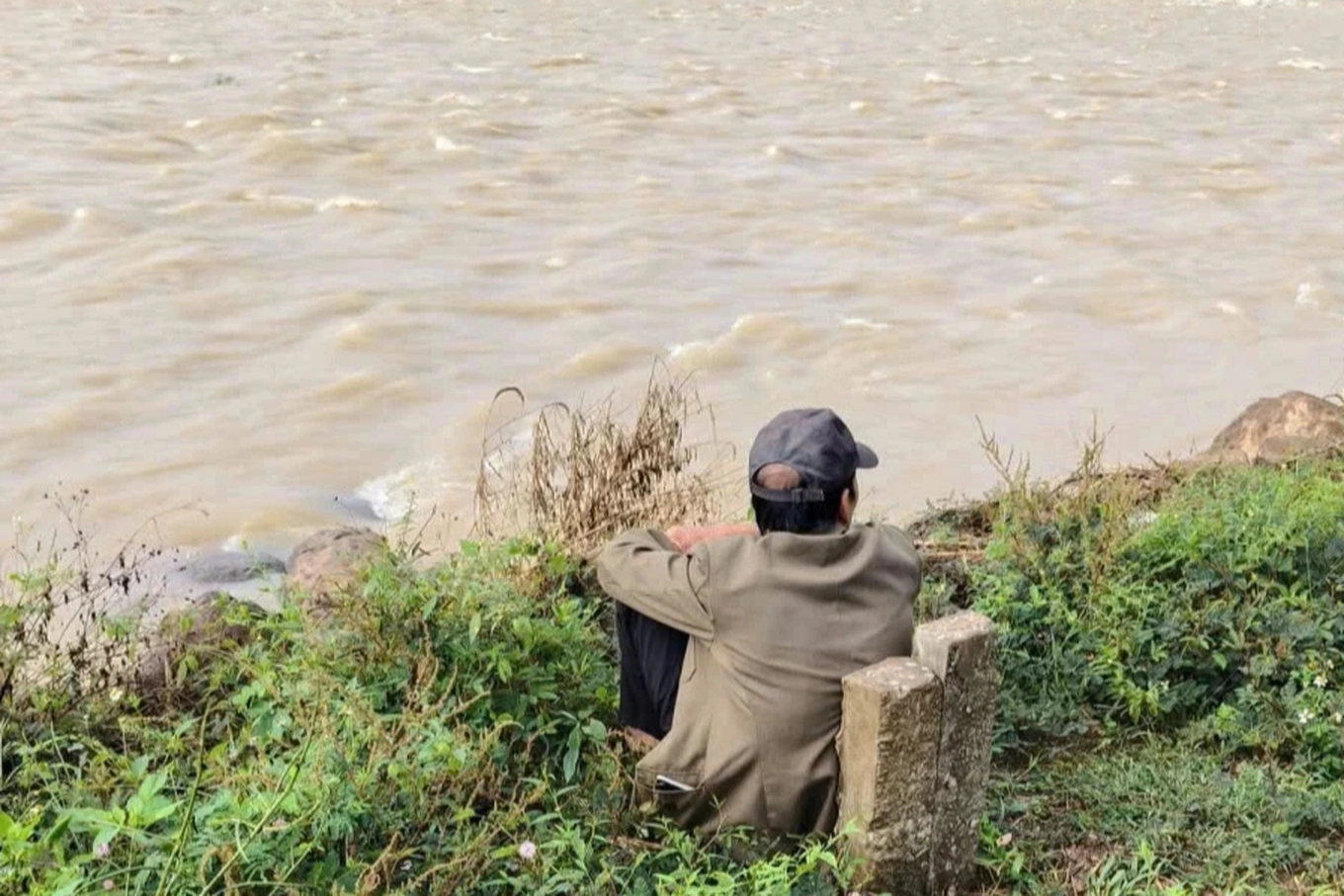 Người bố ngồi ở bờ sông ngóng chờ tin tức con gái suốt nhiều ngày qua. Ảnh: Báo Dân Trí.