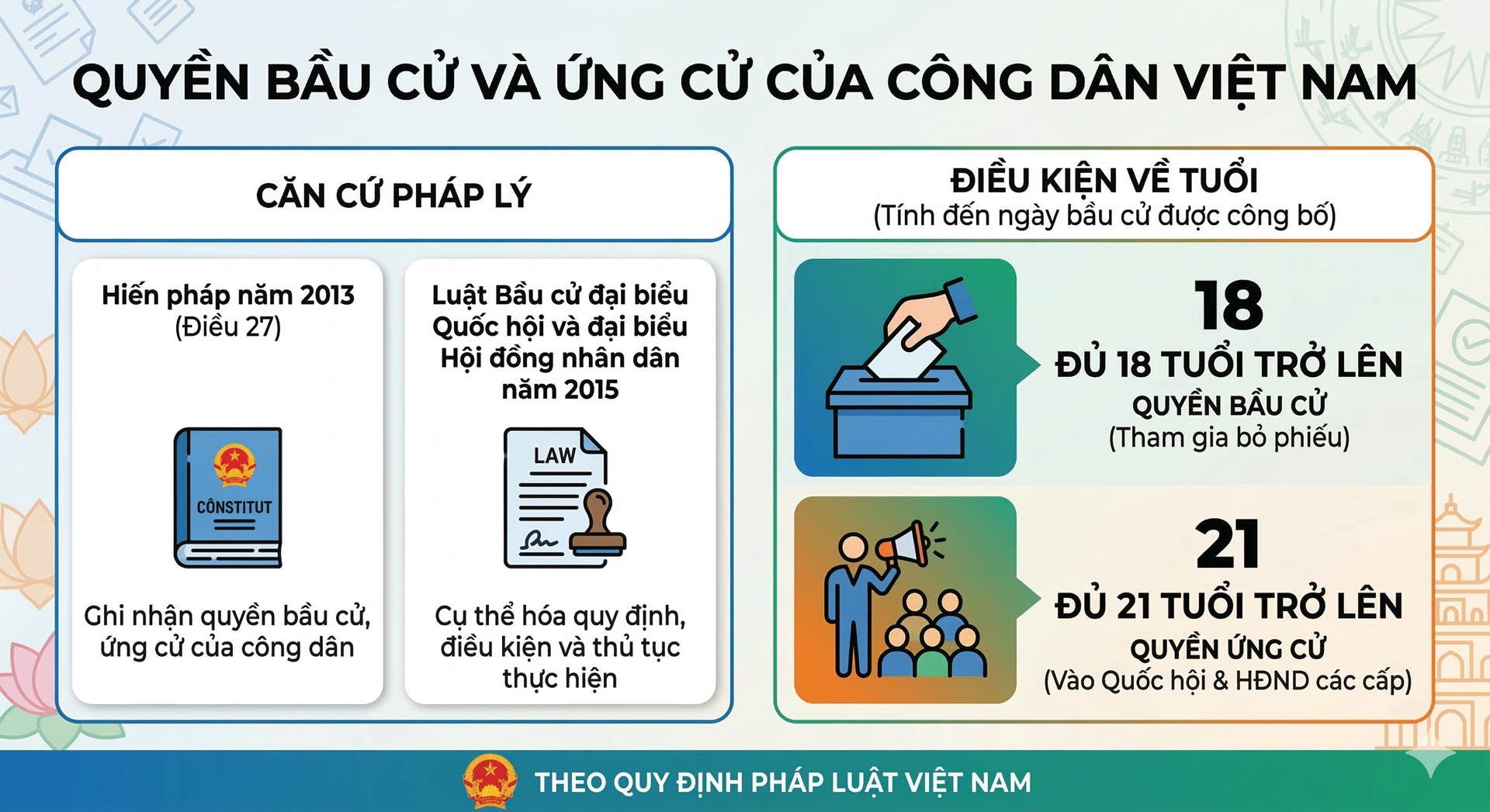 Quyền bầu cử của công dân Việt Nam được ghi nhận trong Hiến pháp năm 2013 và các văn bản pháp luật liên quan. Theo Điều 27 Hiến pháp 2013, công dân Việt Nam từ đủ 18 tuổi trở lên có quyền bầu cử và từ đủ 21 tuổi trở lên có quyền ứng cử vào Quốc hội cũng như Hội đồng nhân dân các cấp. Việc thực hiện các quyền này được quy định cụ thể trong các văn bản pháp luật chuyên ngành.