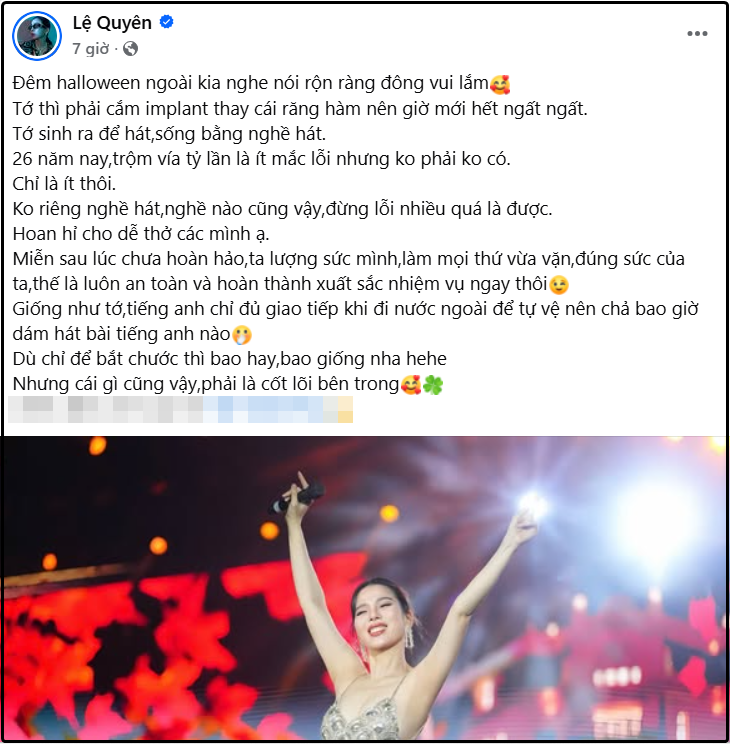 Giọng ca Giấc mơ có thật viết trên trang cá nhân: "Đêm halloween ngoài kia nghe nói rộn ràng đông vui lắm. Tớ thì phải cắm implant thay cái răng hàm nên giờ mới hết ngất ngất.