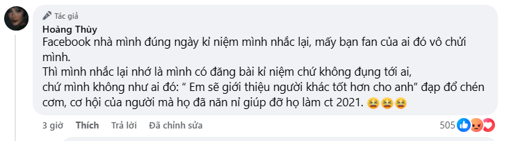 Giữa những ý kiến trái chiều, Hoàng Thùy cũng nhanh chóng lên tiếng gây chú ý. Cô cho biết: "Facebook mình đúng ngày kỉ niệm mình nhắc lại, mấy bạn fan của ai đó vô nói mình. Mình nhắc lại, mình đăng bài kỉ niệm chứ không đụng tới ai".