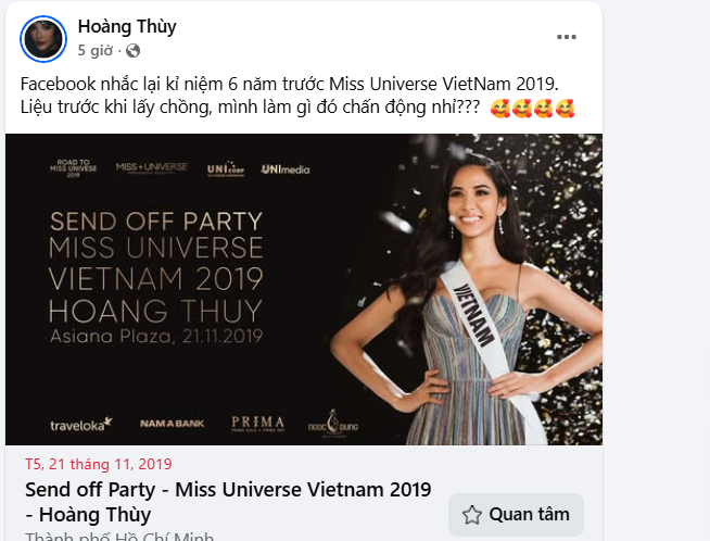 "Facebook nhắc lại kỉ niệm 6 năm trước Miss Universe Vietnam 2019. Liệu trước khi lấy chồng, mình làm gì đó chấn động nhỉ???", người đẹp chia sẻ.