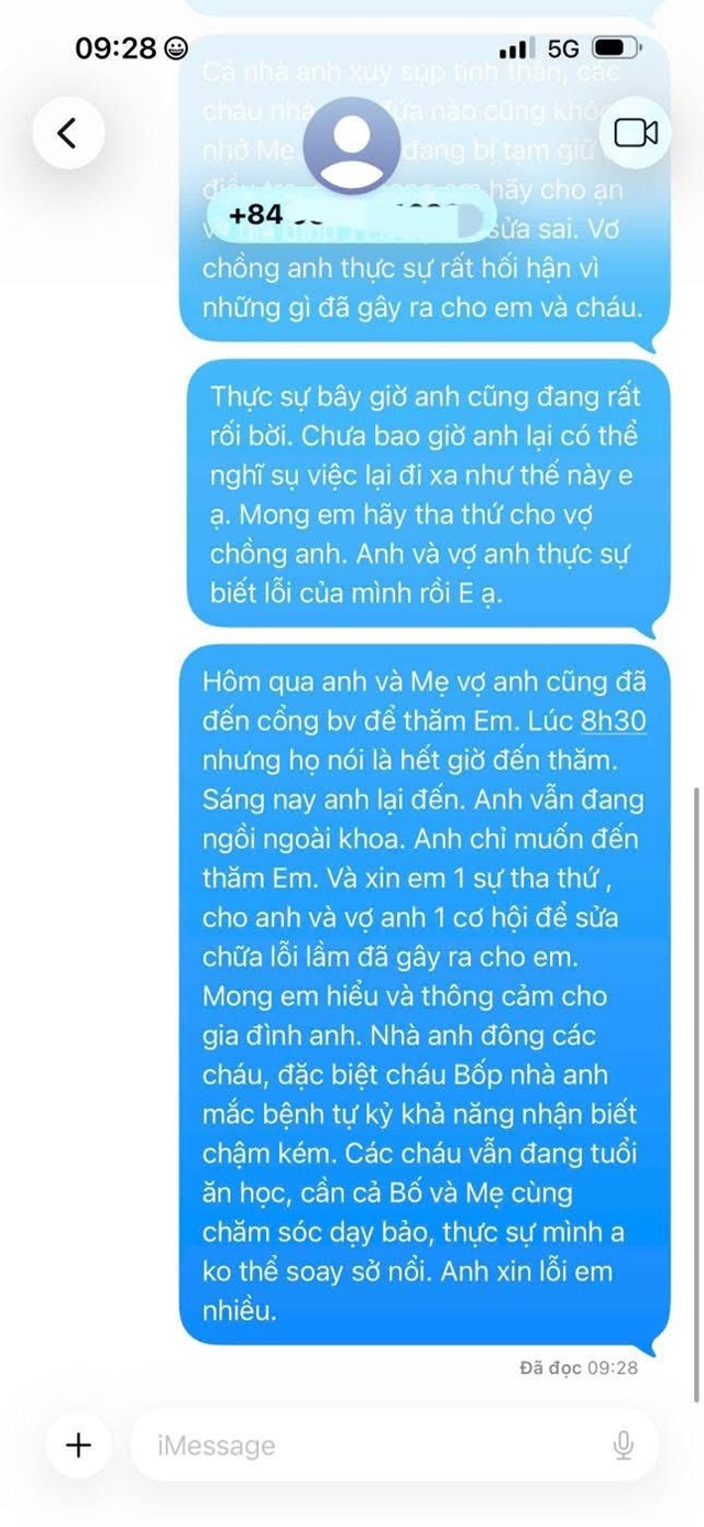 Đáng chú ý, những ngày gần đây, trên mạng xã hội xuất hiện đoạn tin nhắn được cho là của chồng bà Vân Anh gửi cho chị H., bày tỏ sự hối lỗi và mong muốn gia đình được tạo điều kiện sửa sai. Trong nội dung tin nhắn, người này cho biết vợ chồng rất ân hận về sự việc đã xảy ra, đồng thời ngỏ ý đến thăm hỏi nạn nhân.