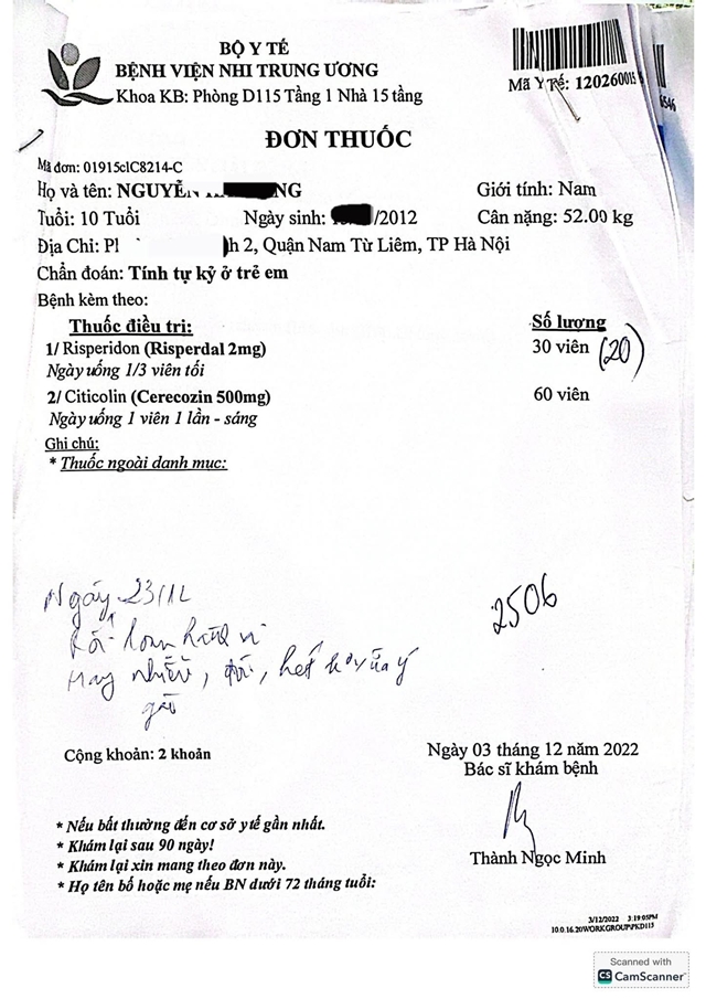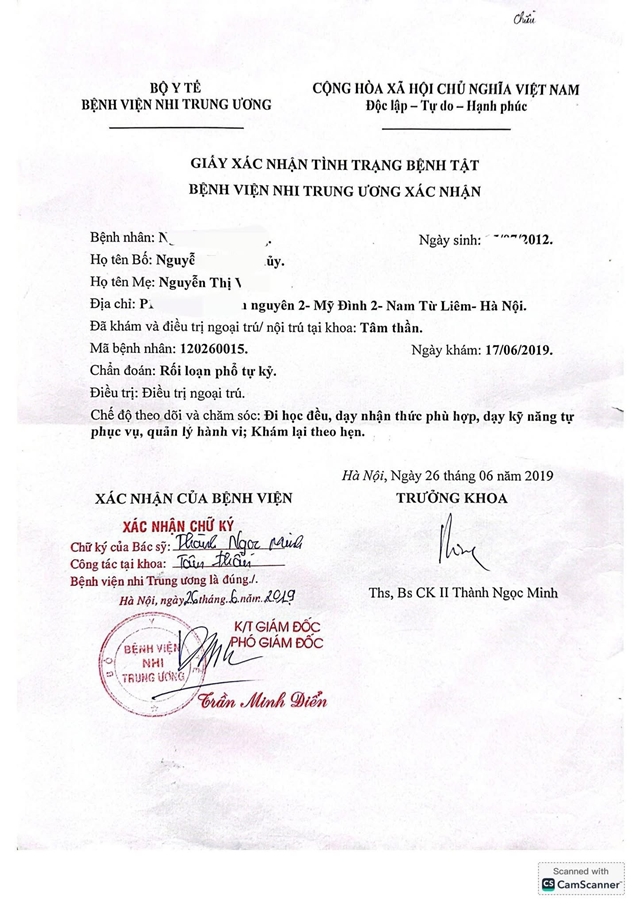 Cùng với đó, một số hình ảnh giấy tờ y tế được cho là hồ sơ thăm khám của cậu con trai đang học lớp 6 trong vụ việc cũng được chia sẻ. Theo các tài liệu này, cậu bé từng được Bệnh viện Nhi Trung ương khám và điều trị liên quan đến lĩnh vực tâm thần, với chẩn đoán rối loạn phổ tự kỷ, quá trình điều trị được cho là kéo dài từ năm 2019 đến nay.