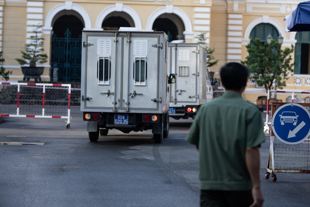 Xe đưa các bị cáo tới toà (Ảnh: Viết Thanh)