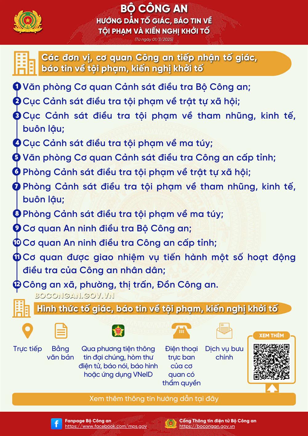Danh sách các cơ quan công an tiếp nhận, giải quyết tố giác, tin báo về tội phạm, kiến nghị khởi tố