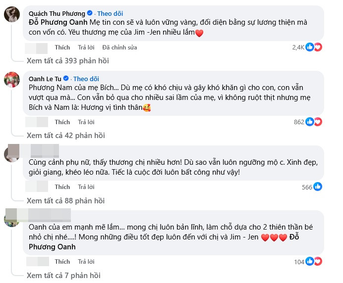 Diễn viên Quách Thu Phương viết: "Mẹ tin con sẽ và luôn vững vàng, đối diện bằng sự lương thiện mà con vốn có. Yêu thương mẹ của Jim-Jen nhiều lắm".
