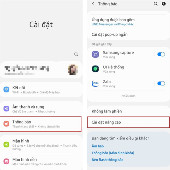 Bước 1: Vào mục Cài đặt của điện thoại > chọn Thông báo > chọn Cài đặt nâng cao.