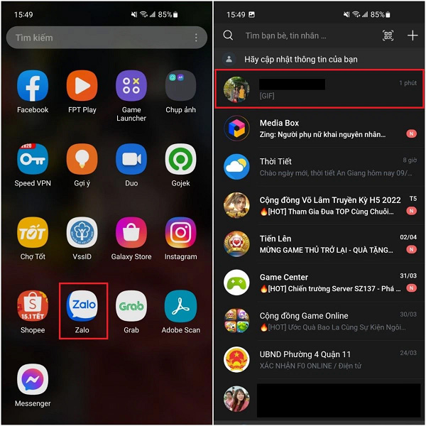 Bước 1: Bạn truy cập vào ứng dụng Zalo trên điện thoại, rồi lựa chọn cuộc trò chuyện có tin nhắn muốn thu hồi.