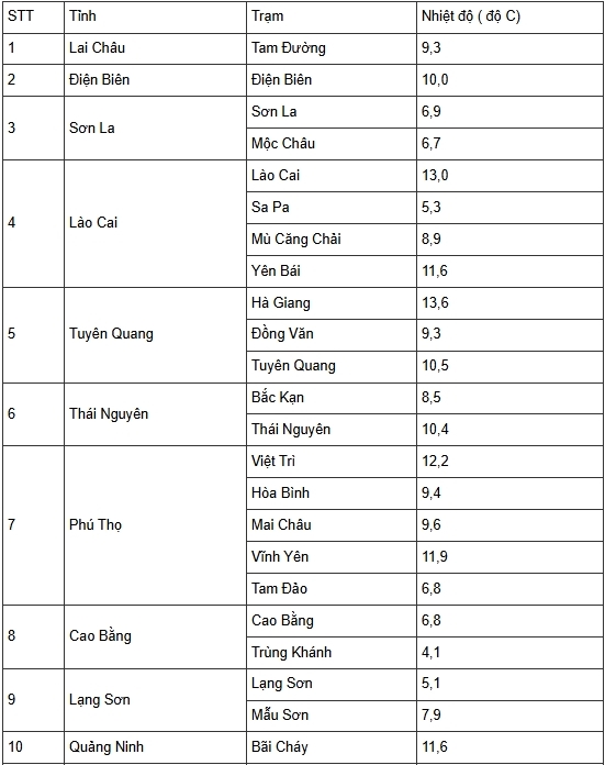 Cụ thể, từ đêm 7-9/1, vùng núi và trung du Bắc Bộ có nhiệt độ thấp nhất 6-9 độ, vùng núi cao có nơi dưới 3 độ; đồng bằng Bắc Bộ và Thanh Hóa 8-11 độ; Nghệ An và Hà Tĩnh 11-13 độ. Khu vực từ Quảng Trị đến TP Đà Nẵng có nhiệt độ thấp nhất 14-17 độ.