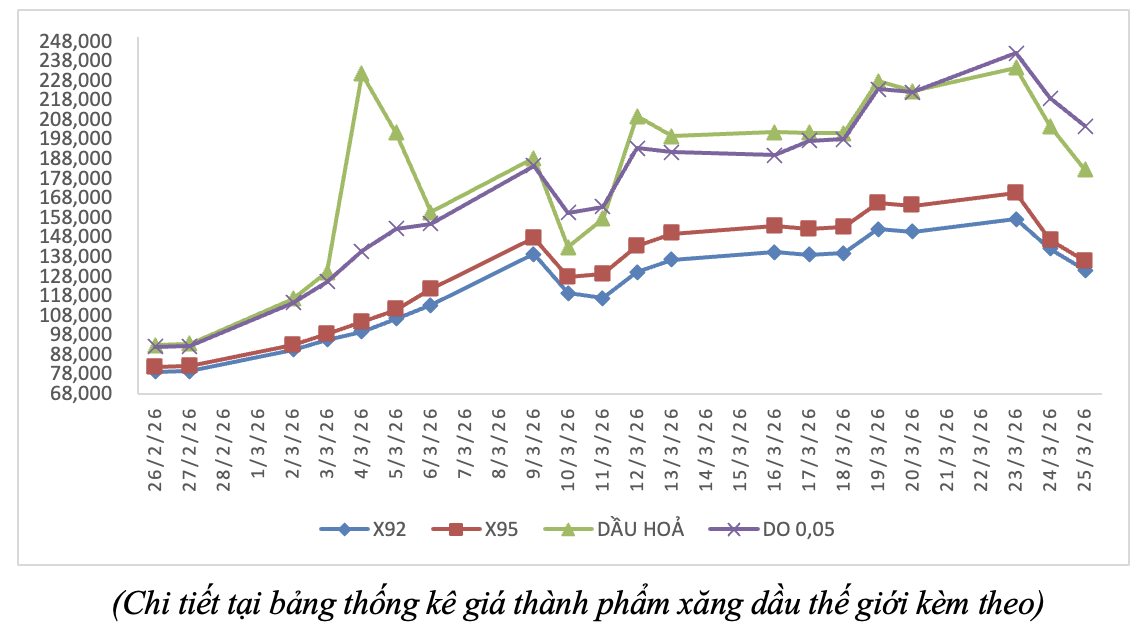 Đêm 26/3, Bộ Công Thương phát đi thông tin về việc điều chỉnh giảm đồng loạt giá các mặt hàng xăng dầu bán lẻ trong nước. Theo đó, từ 24 giờ ngày 26/3 (tức 0 giờ 00 phút ngày 27/3), Thủ tướng Chính phủ ban hành Quyết định số 482/QĐ-TTg về việc áp dụng mức thuế mới thuế bảo vệ môi trường, thuế giá trị gia tăng (VAT), thuế tiêu thụ đặc biệt đối với xăng, dầu và nhiên liệu bay trong trường hợp cần thiết vì lợi ích quốc gia.