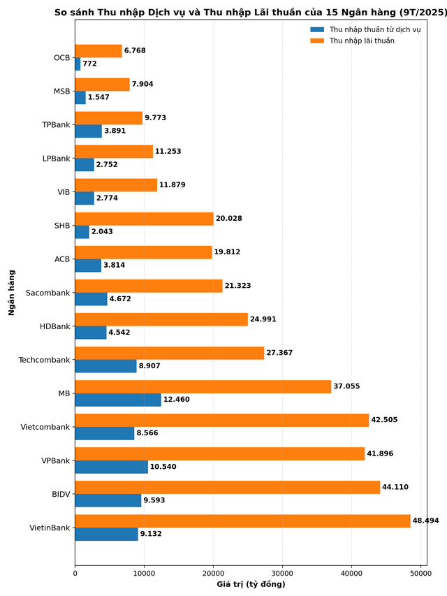 Số liệu 9 tháng đầu năm 2025 cho thấy, ngay cả ở nhóm ngân hàng định hướng bán lẻ và dịch vụ, quy mô thu nhập thuần từ dịch vụ vẫn thấp hơn đáng kể so với thu nhập lãi thuần. Biểu đồ so sánh thu nhập từ dịch vụ và thu nhập lãi thuần của 15 ngân hàng niêm yết cho thấy, thu nhập từ dịch vụ cũng chỉ bằng khoảng 9-30% so với quy mô thu nhập từ lãi thuần.