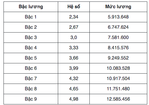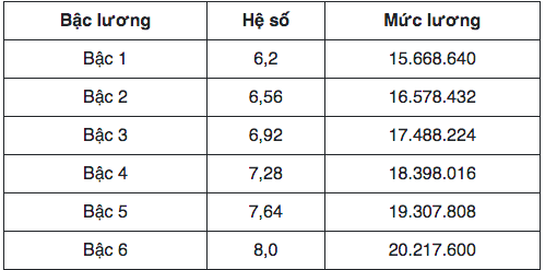 Ngoài ra, tiền lương cho các nhóm công chức, viên chức hàng chuyên gia kỹ thuật nhóm A3 (nhóm A3.1) (từ bậc 6,2 tới 8) cũng tăng đáng kể. Cụ thể, công chức hàng A3 bậc 6 có thể nhận mức lương cao nhất lên tới 20.240.000 đồng.