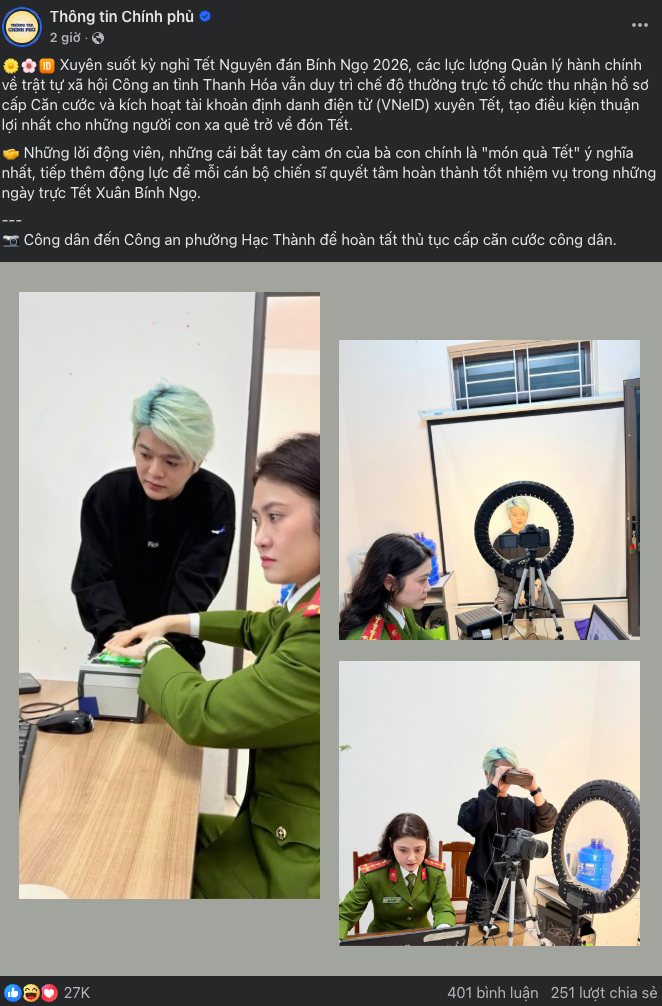 Câu chuyện chưa dừng lại ở đó. Loạt ảnh này sau đó được trang Thông tin Chính phủ đăng tải trong một bài viết về hoạt động xuyên Tết của lực lượng quản lý hành chính. Nội dung chia sẻ nhấn mạnh việc Công an tỉnh Thanh Hóa duy trì chế độ thường trực trong kỳ nghỉ Tết Nguyên đán Bính Ngọ 2026, tổ chức thu nhận hồ sơ cấp căn cước và kích hoạt tài khoản VNeID, tạo điều kiện thuận lợi cho người dân trở về quê ăn Tết. Hình ảnh “công dân đến Công an phường Hạc Thành để hoàn tất thủ tục cấp căn cước công dân” nhanh chóng được cộng đồng mạng nhận ra là RHYDER.