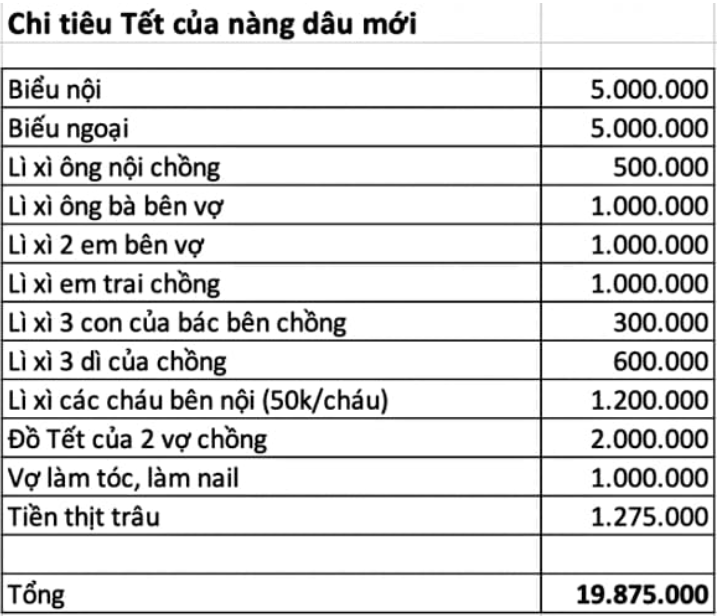 Năm đầu làm dâu, cô vợ trẻ dự trù tiêu Tết 19 triệu đồng, mẹ chồng nhìn bảng chi tiêu cũng chỉ biết 'thở dài'