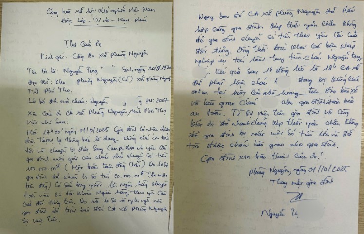 Xúc động khi đón được con an toàn trở về, anh T. (bố cháu D.) đã viết thư cảm ơn Công an xã Phùng Nguyên, bày tỏ sự biết ơn trước tinh thần, trách nhiệm của lực lượng Công an xã trong việc bảo vệ an toàn tính mạng của Nhân dân.