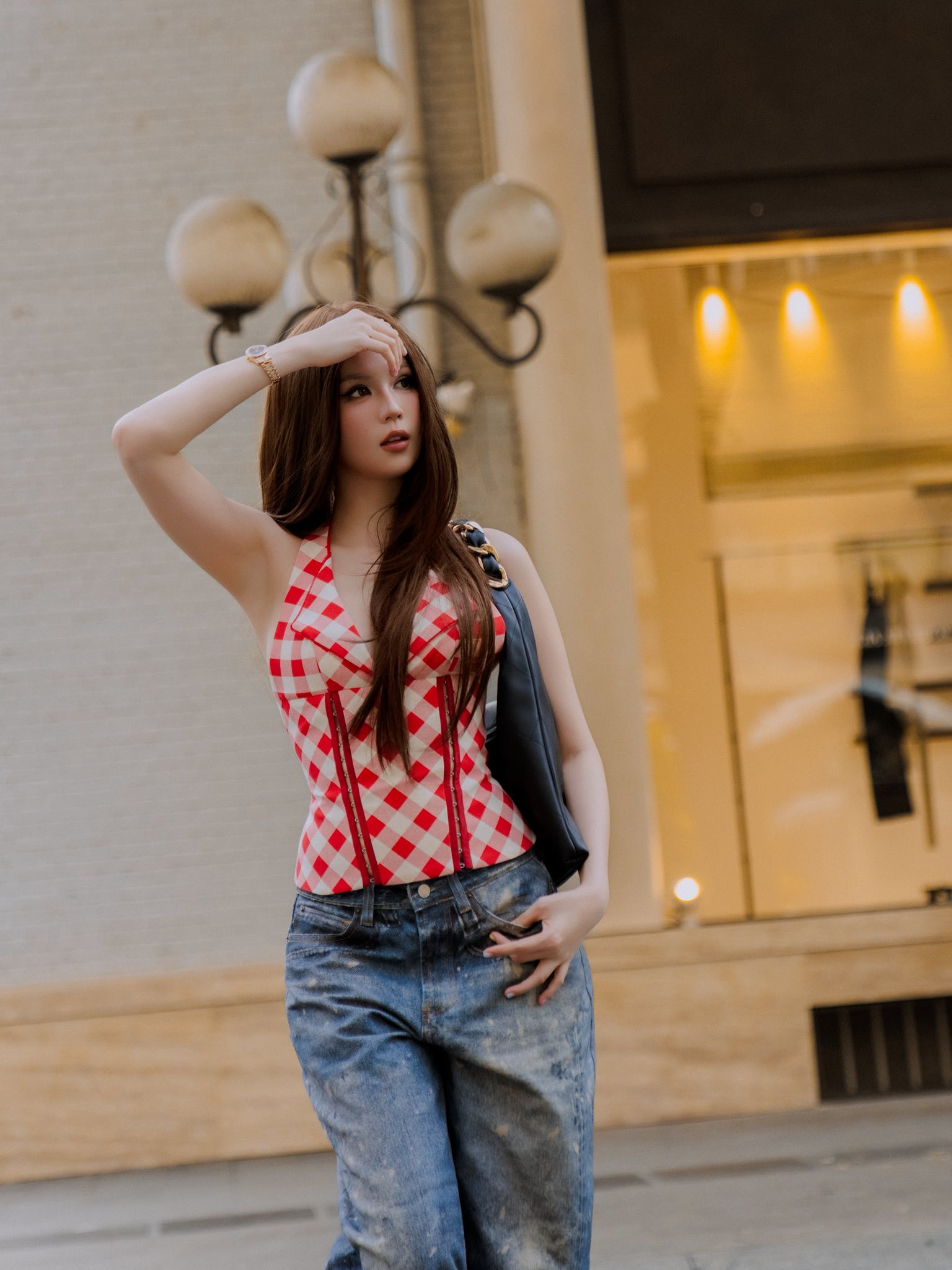 Mới đây, Ngọc Trinh xả bộ ảnh khoe street style cực "cháy". Trong hình, mỹ nhân 8x diện áo kẻ caro đỏ có chi tiết khoét ngực sâu khoe vòng 1 căng tràn sức sống.