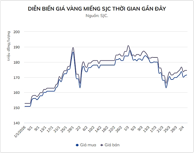 Ngay sau khi chạm đỉnh, áp lực chốt lời xuất hiện khiến giá vàng quay đầu điều chỉnh khá nhanh. Đến ngày 3/4, giá giảm xuống còn 170 - 173,5 triệu đồng/lượng, tương ứng mức giảm khoảng 3,7 triệu đồng/lượng ở chiều mua vào và 3,2 triệu đồng/lượng ở chiều bán ra.