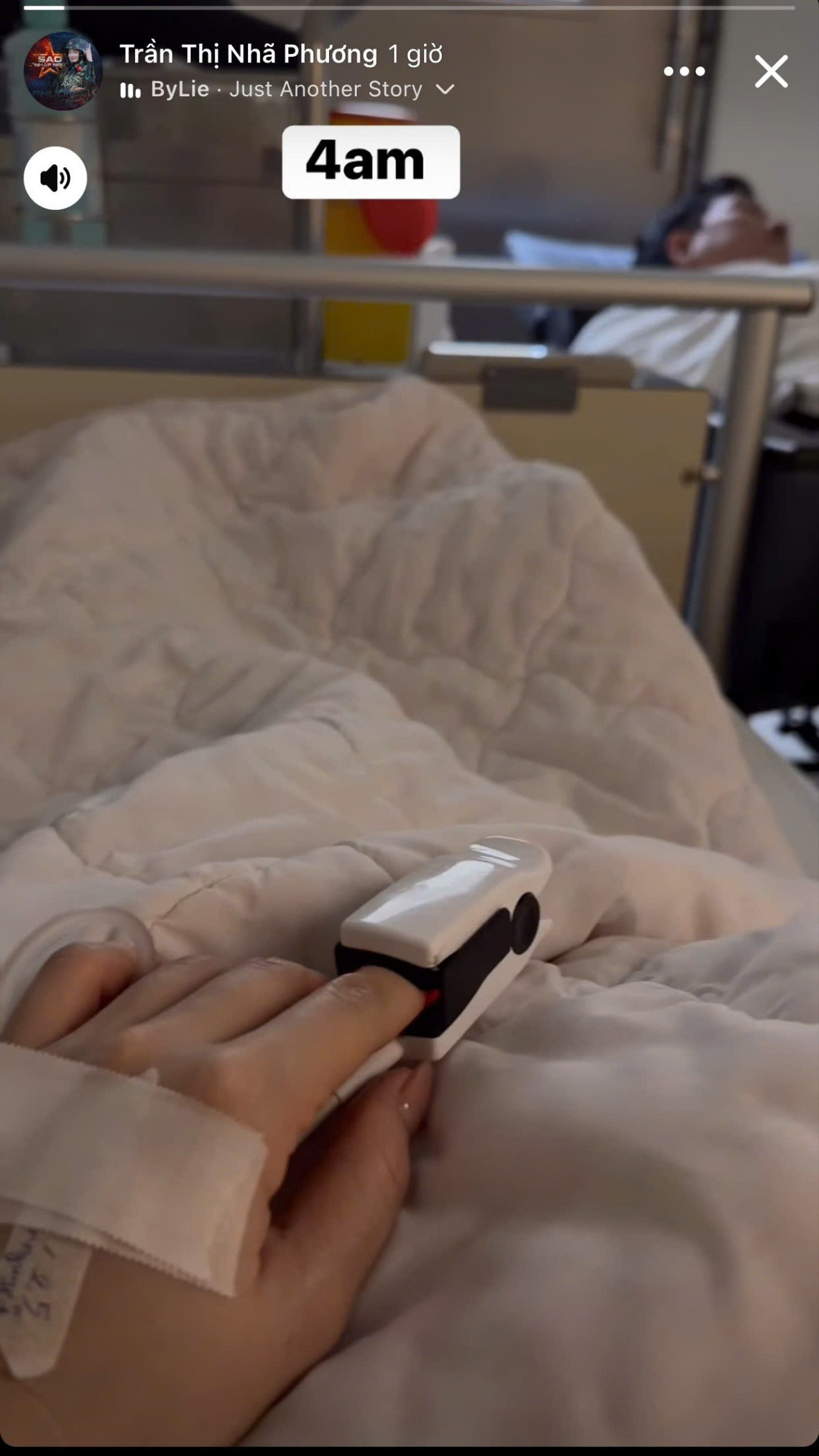 Đầu tháng 11, Nhã Phương gây xôn xao khi bất ngờ chia sẻ đoạn story đang nằm trong bệnh viện. Cụ thể, người đẹp để lộ khoảnh khắc tay được truyền nước và gắn dụng cụ đo SpO2, phía xa là ông xã Trường Giang đang nằm túc trực.