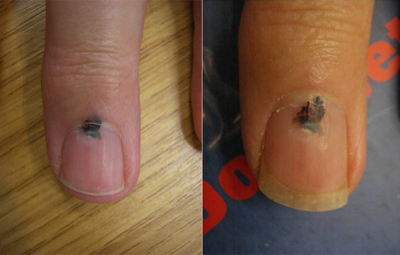 Nếu móng tay hoặc móng chân của bạn xuất hiện một đường sọc hoặc mảng màu đen/nâu sẫm chạy dọc mà không phải do chấn thương trước đó, đây có thể là dấu hiệu của UT hắc tố dưới móng (Subungual Melanoma). Tình trạng này dễ bị nhầm lẫn với nấm móng. Nếu vệt đen lan rộng ra phần da xung quanh móng (dấu hiệu Hutchinson), không đối xứng và màu sắc không đều, cần đi khám ngay.