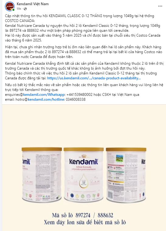 Theo thông tin từ nhà sản xuất Kendal Nutricare Canada, đợt triệu hồi này được thực hiện như một biện pháp phòng ngừa thận trọng liên quan đến độc tố vi khuẩn cereulide. Các sản phẩm bị ảnh hưởng cụ thể là dòng Kendamil Costco Classic First Infant Formula loại 1049g, mang mã lô sản xuất 897274 và 888632. Đây là những lô hàng được sản xuất vào tháng 5/2025 và chỉ được phân phối duy nhất thông qua hệ thống siêu thị Costco tại Canada từ tháng 6/2025.