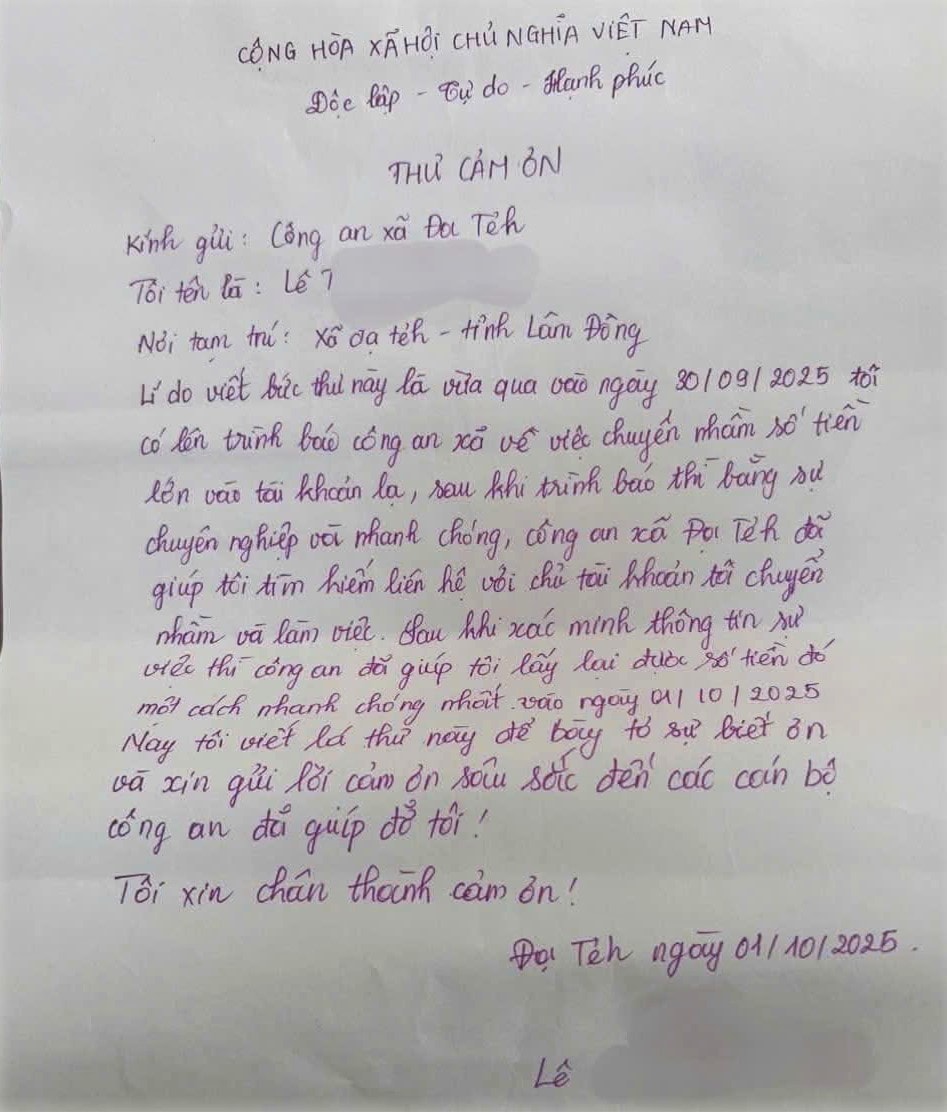 Sau khi nhận được lại số tiền trên chị L.T.T bày tỏ lòng biết ơn sâu sắc và có viết lá thư tay cảm ơn tới lực lượng Công an xã Đạ Tẻh.